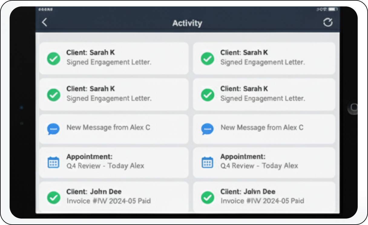 Stay ahead with live data and immediate updates on your business's critical metrics. The dashboard continuously refreshes, providing a dynamic snapshot of your current operational status. Never miss an important event or action across your TAAX App Pro ecosystem. The centralized activity feed keeps you fully informed and helps you track team progress and client interactions