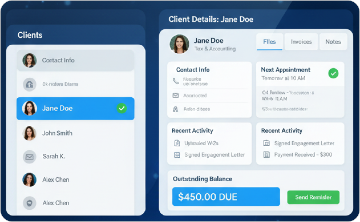 TAAX APP is your one-stop shop for success. Manage appointments, streamline workflows, connect with clients, and more – all from a single, user-friendly platform.