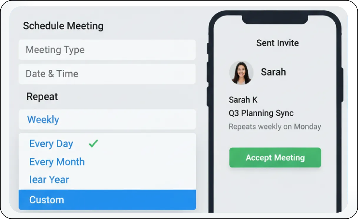 Simplify the entire process of organizing and inviting participants to your virtual meetings. Our seamless integration ensures a streamlined, error-free workflow from the moment you conceive a meeting to the point of connection