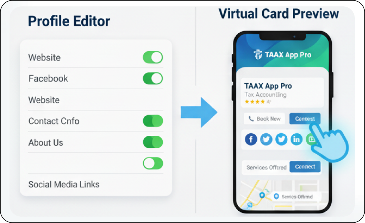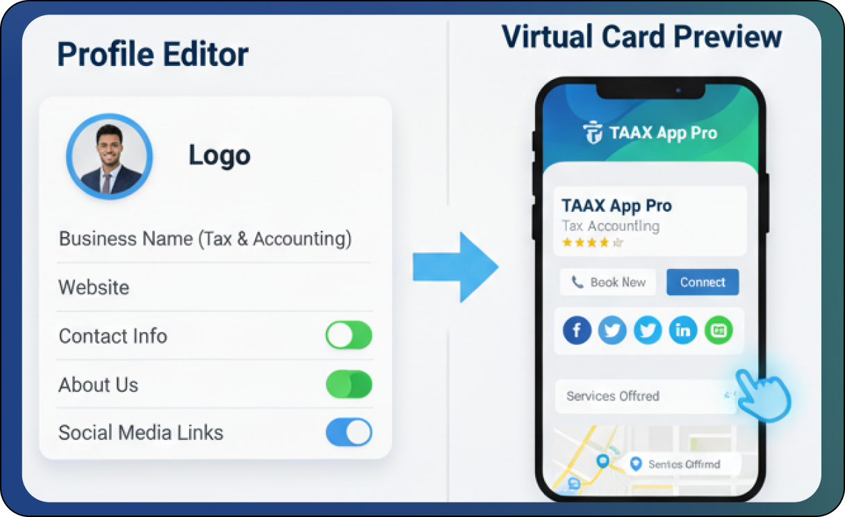 The TAAX App Pro Virtual Business Card is deeply integrated into your entire TAAX App Pro ecosystem, creating a cohesive and powerful tool for managing your contacts and strengthening all your business relationships.